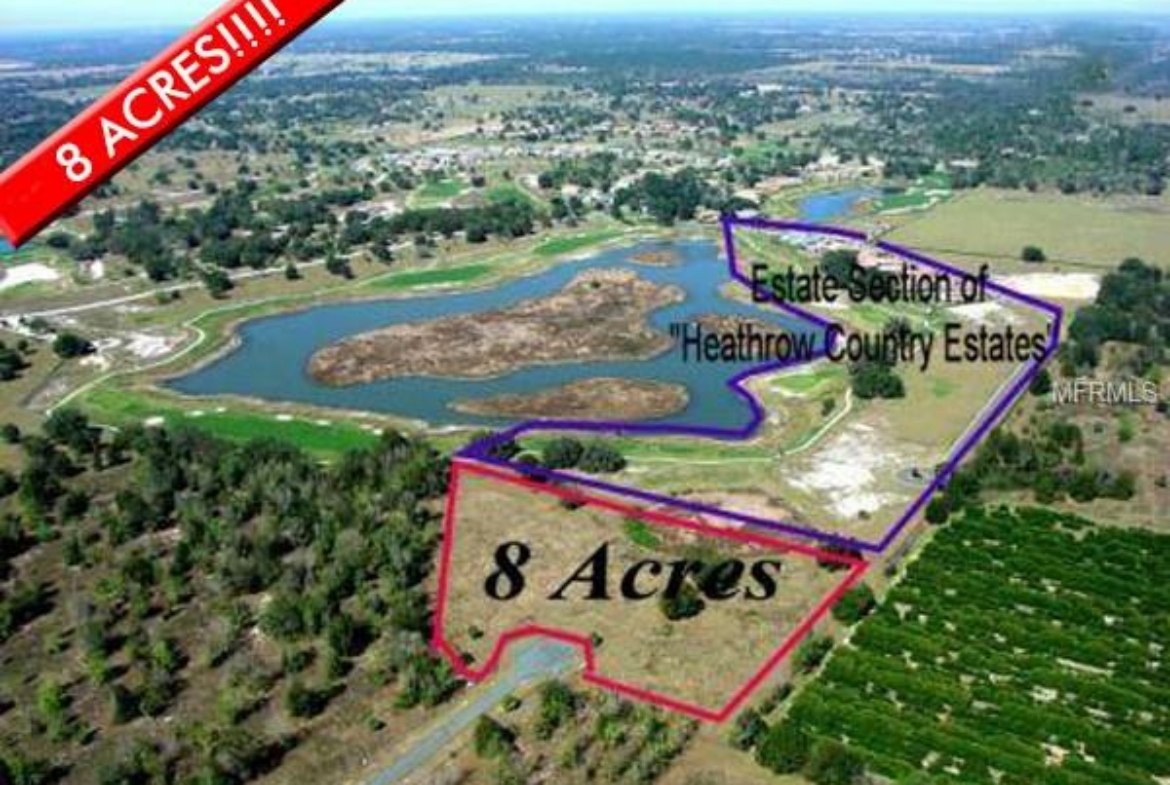 This is an amazing 8 acres of property which is located in the rear of Red Tail Country Club (access off hwy 46) bordering the golf course. Close to the new 429 entrance and exit for the beltway. A small pond which you are sharing with Red Tail Country Club and a wooden fence is separating you from this world class development. Build a 12,000 sqft home, add a guest house, enjoy your own tennis court. Join the Heathrow Country Estates golf course and park your million dollar motor home or any toy right next to your home. And yet, you are not paying for the Heathrow Country Estate HOA, you are not under their restrictions, you own your own compound at the end of this quaint cul-de-sac. And yes, Mount Dora and Lake Mary with their great restaurants and shops is just close by.